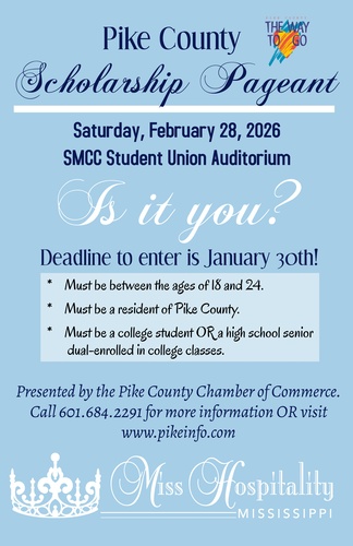 The 2026 Pike County Miss Hospitality Pageant will be held Saturday, February 28th in the SMCC Student Union Auditorium. Contestants will compete in a cocktail dress competition and present their "Pike County Tourism" commercials.